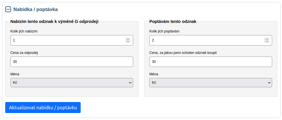 Po uložení je nabídka/poptávka zaevidována a můžete se podívat na jejich seznam (moje nabídky, moje poptávky) a zároveň se můžete podívat, zda se vaše nabídky/poptávky nemají průnik s nabídkami/poptávkami jiných sběratelů.